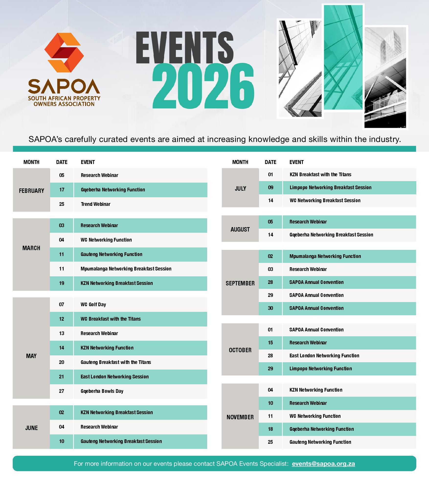 Being the industry representative for an estimate 90% of the country’s commercial and industrial real estate companies, SAPOA’s mandate is to continuously endeavour to represent, protect and advance its members’ interest – and in doing so, maximise its level of activity within the sector, thus cementing its commitment to the realisation of a more vibrant, globally competitive industry.
